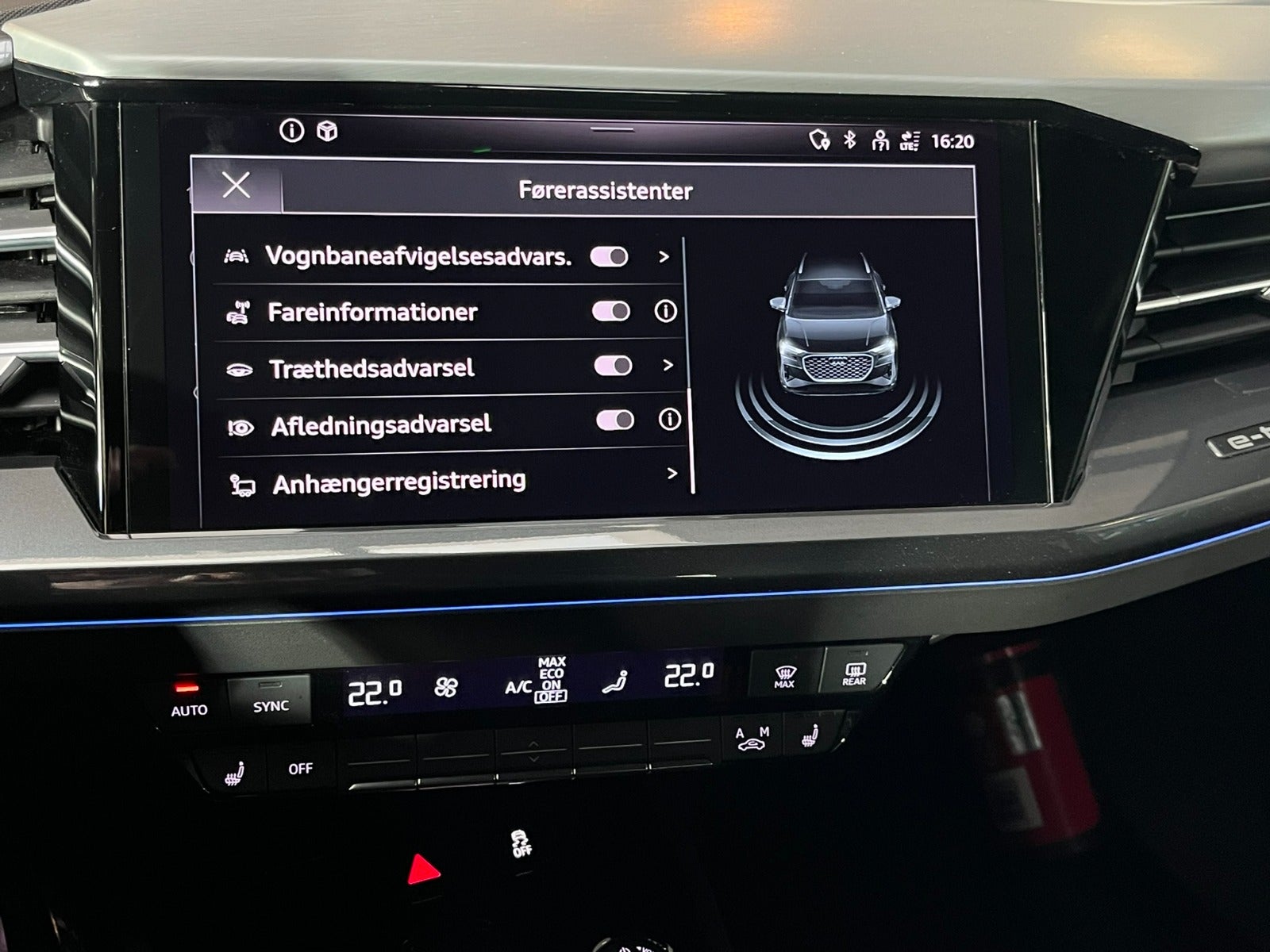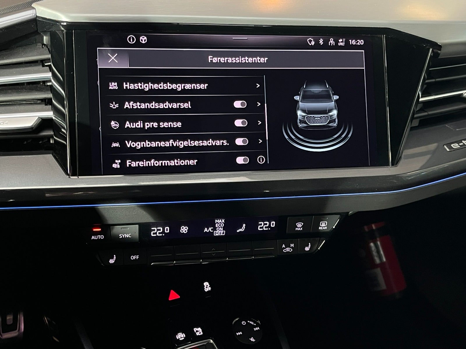 Sædevarme foran, skiltegenkendelse, DAB-radio, virtuelt cockpit, sort loftshimmel, køreprofilvalg, el-klapbare sidespejle m. varme, fjernlysassistent, DC-batteriopladning (LH3 opladning op til 175KW), parkeringssensor for og bag, læder sportsrat m. multifunktion, elektrisk betjent børnesikring, auto. nedbl. bakspejl, Audi sound system, front assist, el indst. lændestøtte, elektrisk parkeringsbremse, musikstreaming via bluetooth, kørecomputer, højdejust. forsæder, 4x el-ruder, udv. temp. måler, isofix, armlæn, kopholder, ikke ryger, lev. nysynet.